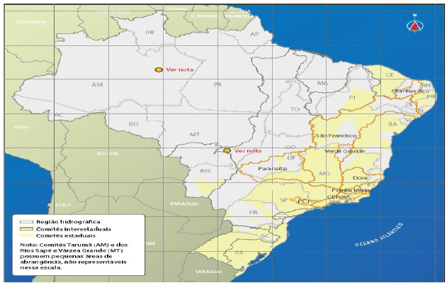 A disposição dos Comitês estaduais e interestaduais de Bacias Hidrográficas no território brasileiro é representada na Figura 3, permitindo afirmar que no Brasil há um direcionamento das políticas nacionais de recursos hídricos nas localidades mais afetadas pelo crescimento populacional, pela poluição dos recursos ou pelos períodos de secas e cheias.