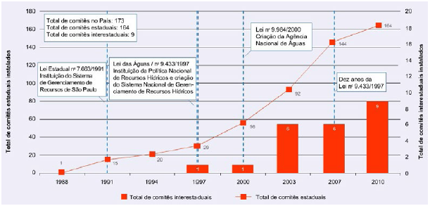 Um fator importante da descentralização do gerenciamento hídrico no Brasil é que as unidades de gerenciamento – em nível estadual e na órbita da bacia – têm de propor seus próprios programas de desenvolvimento. Esse mecanismo assegura a consolidação e integração dos planos de bacia, em nível de estado, e as interfaces entre estados, bem como com planos regionais, municipais e urbanos, que, depois de formulados, são revisados pelo congresso e transformados em leis (TORTAJARA, 2002). Essa característica faz com que seja possível “a consolidação dos espaços micro e regional, sem detrimento de uma sistemática informacional que também necessita ser assegurada” (THEODORO, 2002 apud SOARES; THEODORO; JACOB, 2008). Outro fator de evolução na qualidade do gerenciamento brasileiro são os Comitês de Bacias que, mesmo incipientes, representam grandes avanços em direção ao uso sustentável da água em localidades de estresse hídrico no Brasil (COSTA, 2003). No Balanço emitido em 2011 pela ANA, aponta-se a existência de 173 Comitês no país – 164 estaduais e nove interestaduais. A cronologia do avanço pode ser visualizada na Figura 2.
