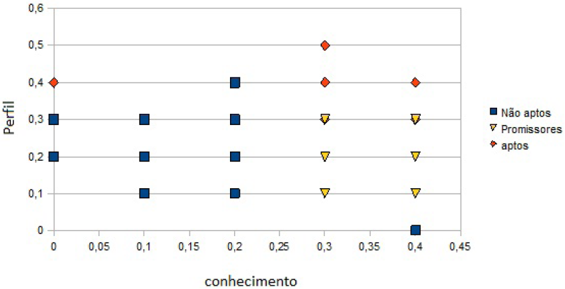 Verifica-se que foi possível separar os três clusters (Figura 5): os candidatos que não são aptos (em azul) são aqueles que não apresentaram o perfil e o conhecimento desejado para a área estabelecida. Os candidatos promissores (em amarelo) apresentaram o perfil abaixo do exigido para a vaga, porém, com o conhecimento igual ou acima do esperado. E os candidatos aptos (em vermelho) apresentam tanto o perfil quanto o conhecimento dentro dos requisitos estabelecidos para a vaga, ou seja, que tem a possibilidade de atender as expectativas da empresa.