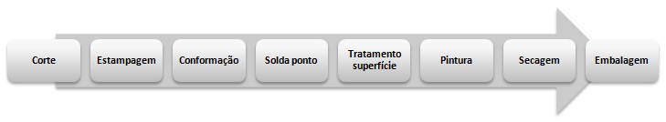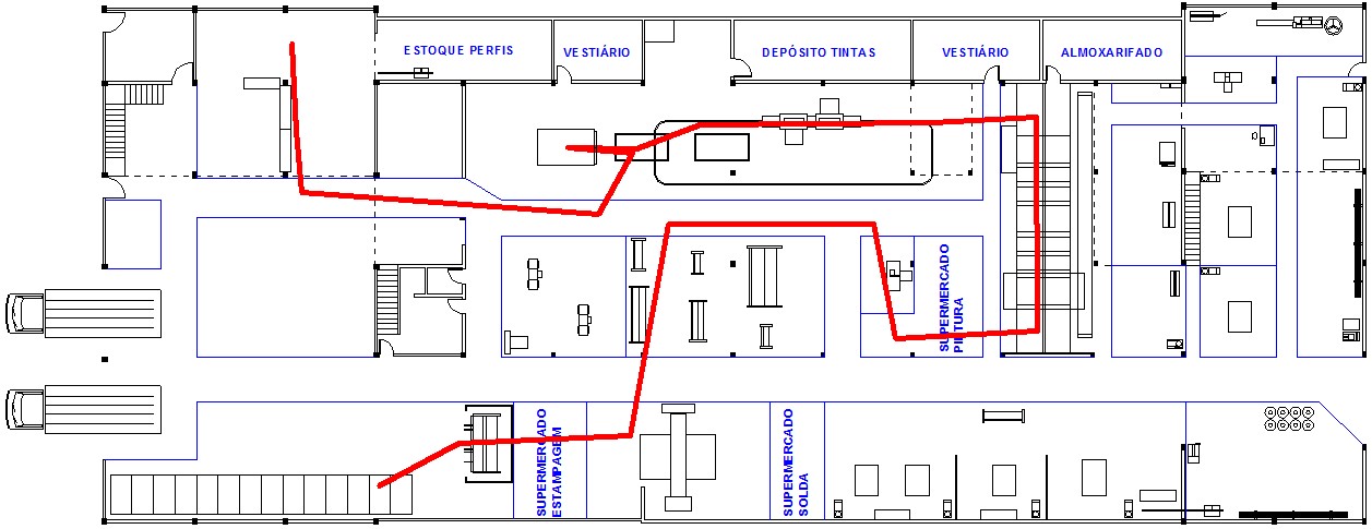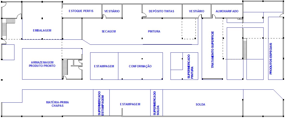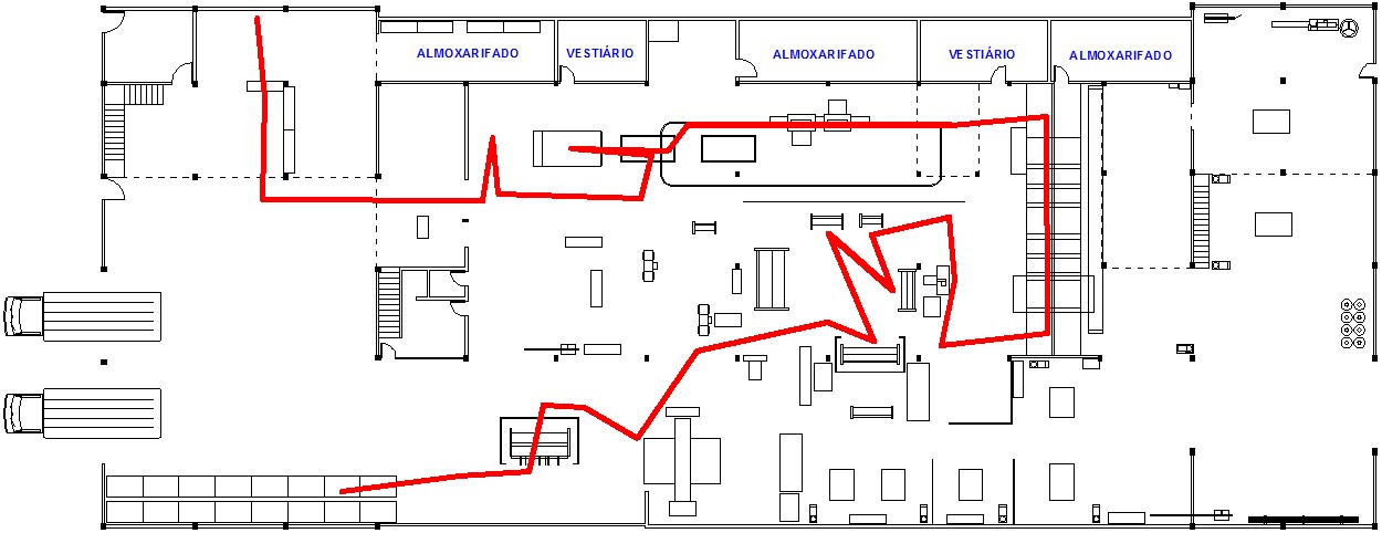Conforme mostra a Figura 3, a fabricação do lote do item inicia na área de estocagem de matéria-prima (parte inferior da figura) para o setor de corte, passando para a estampagem e conformação. Em seguida, os produtos passam pela área de solda para, depois disso, iniciar o tratamento de superfície, pintura e secagem. Por último, os itens são embalados e armazenados. O trajeto percorrido por um lote desse produto totaliza aproximadamente 151 metros.