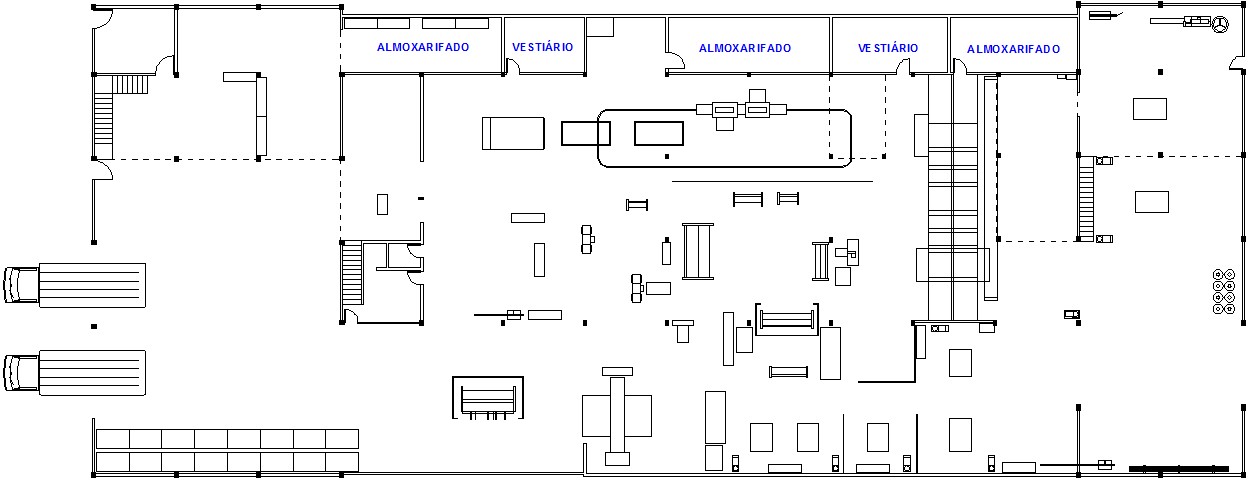 Observando o tipo de processo e a área produtiva, pode-se afirmar que o tipo de processo utilizado pela empresa é em lotes, distribuído por intermédio de um layout por processo, embora a divisão entre as áreas não seja clara. Recentes ampliações realizadas, que acrescentaram cerca de 800m2 ao pavilhão, resultaram em uma ocupação sem um planejamento adequado para bom aproveitamento das novas áreas disponíveis. Há áreas sem uso, assim como espaços com excesso de materiais. Observando a planta, pode-se verificar que não há delimitações para os centros de trabalho e corredores para circulação, o que torna o fluxo confuso e prejudica o processo, pois muitas vezes o transporte de peças de um local a outro depende da movimentação de outros itens. Não há, também, um padrão determinado para o fluxo das peças dentro do processo, dificultando o controle visual e a organização da fábrica como um todo.