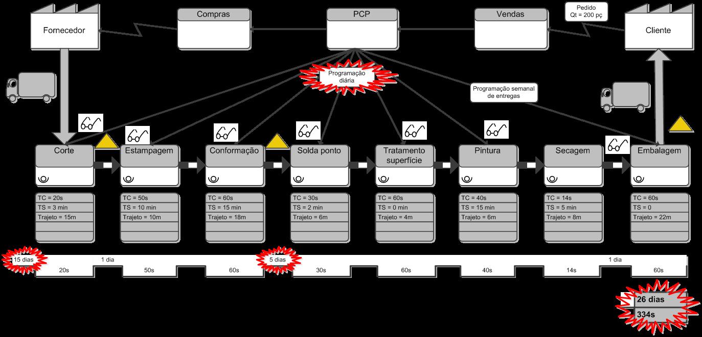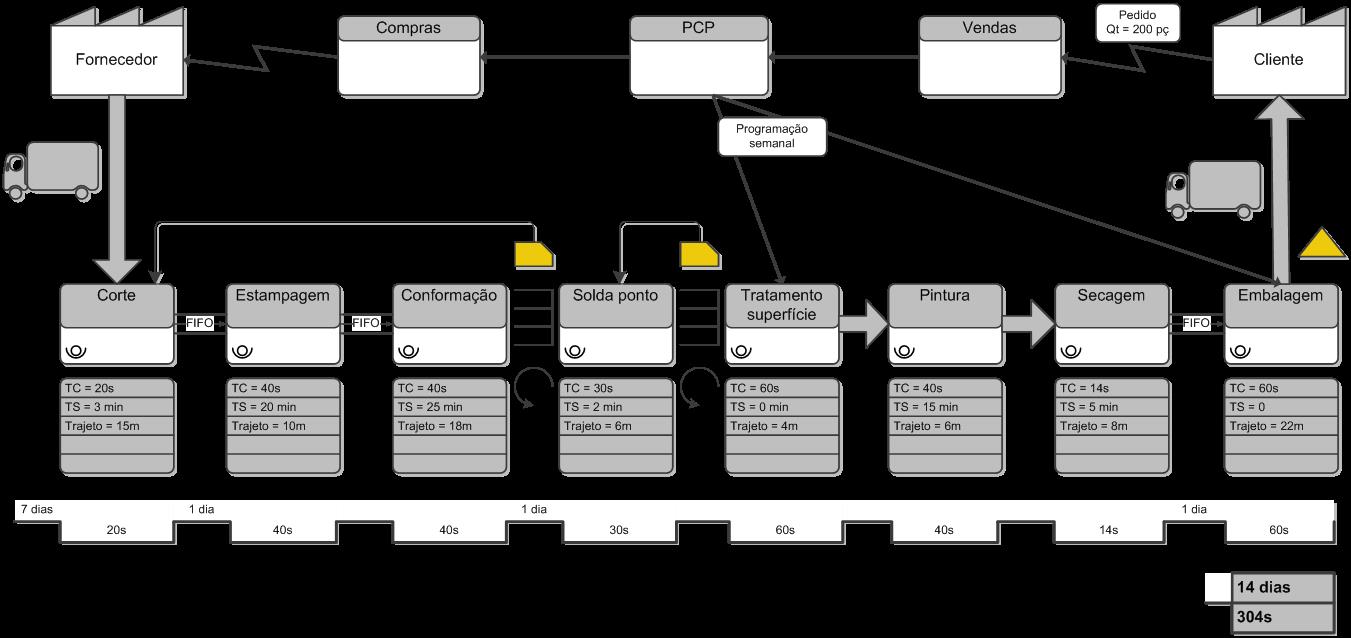 Como pode ser visto no mapa do fluxo de valor, após receber o pedido por parte do cliente, o setor de vendas encaminha ao setor de planejamento e controle da produção (PCP), o qual realiza programação diária da produção e a repassa a cada setor envolvido de forma não relacionada. Ao passar pelo setor de corte, cria-se um estoque intermediário devido ao tempo de ciclo do setor de estampagem ser maior (50s). Após o setor de conformação, também se cria estoque intermediário antes do setor de solda, pois esta atividade não é realizada de forma contínua, ou seja, não há um operador dedicado de forma integral. Como não há demarcação de áreas, o estoque intermediário formado fica muitas vezes obstruindo outros processos. O trajeto percorrido pelos itens entre um processo e outro também foi medido, por ser fator relevante na elaboração de layout.