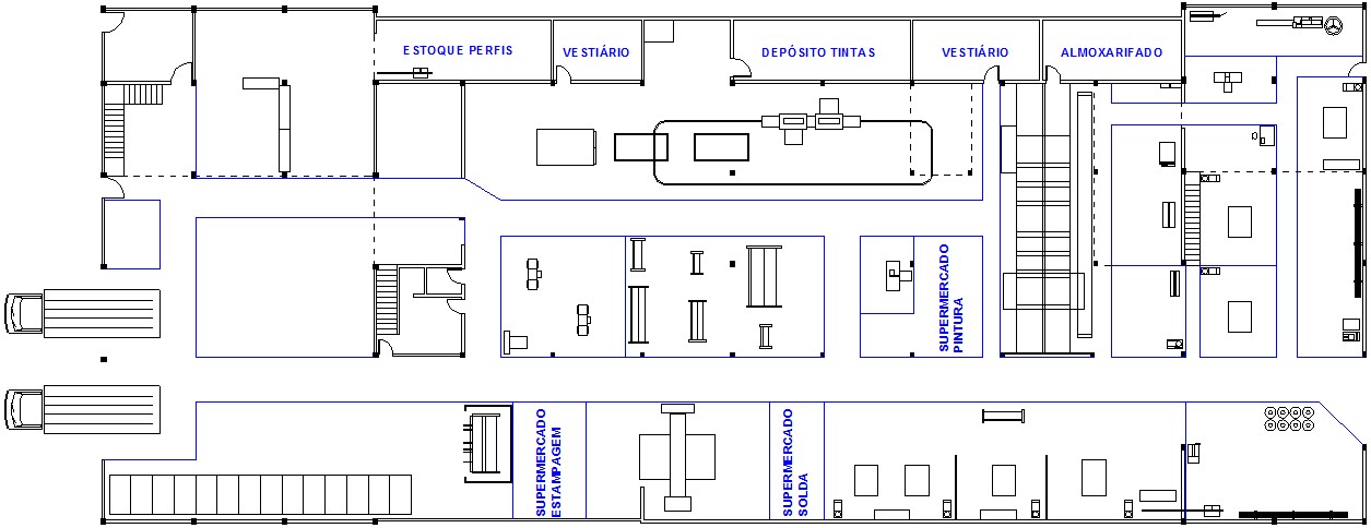 Observa-se na Figura 8 que o fluxo do item inicia no setor de corte, passando para a estampagem e conformação. Os setores estão próximos, e há área suficiente para operação e circulação. Após o setor de conformação, há um supermercado para as peças que chegam para a soldagem e outro supermercado para a pintura, posicionado antes do setor de tratamento de superfície. Passando pelo tratamento de superfície, pintura e secagem, as peças vão para a embalagem, onde são armazenadas. No layout proposto, o fluxo é facilitado, com espaço suficiente para circulação de peças e supermercados e com centros de trabalho adequadamente dimensionados.