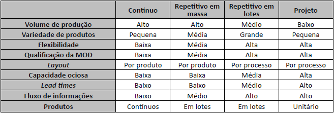 Moreira (2002) define sistema de produção como o conjunto de atividades e operações inter-relacionadas envolvidas na produção de bens ou serviços. Nesse sentido, Tubino (2006) classifica os sistemas de produção em quatro tipos, associados ao grau de padronização dos produtos e ao volume de produção. O autor traz uma comparação resumida das principais características da classificação dos sistemas de produção, como pode ser visto no Quadro 1.
