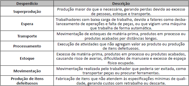 A produção enxuta surgiu no Japão, com o nome de Sistema Toyota de Produção (STP), na década de 50, após a Segunda Guerra Mundial, mas só começou a chamar a atenção do mundo a partir de 1973. A base do STP, de acordo com Ohno (1997), é a eliminação de todo e qualquer desperdício, o que pode aumentar amplamente a eficiência e, consequentemente, reduzir os custos de fabricação. Entende-se por desperdício todos os elementos de produção que não agregam valor ao produto, sendo classificados em sete categorias, conforme mostra o Quadro 2.