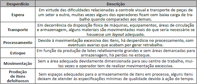 Como forma de definir os pontos a levar em conta na elaboração da proposta de layout, foram identificadas as perdas existentes no processo atual. A base para essa análise é constituída dos sete tipos de perdas provenientes do sistema de produção enxuta. Foram elencados os tipos de perdas que têm relação direta com o layout industrial. Portanto, as perdas de superprodução não foram consideradas por estarem relacionadas a uma decisão de nível gerencial.