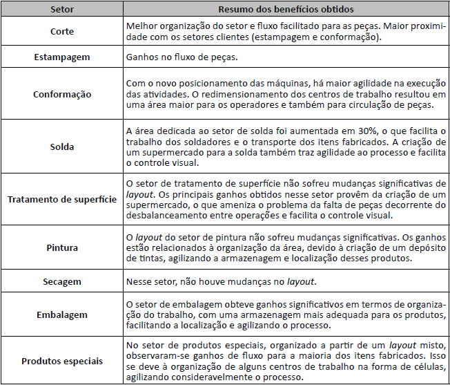Com a implantação do layout proposto, diversas vantagens podem ser obtidas em relação à produção enxuta, com diminuição do lead time, eliminação ou minimização de alguns tipos de perdas, diminuição de estoques intermediários, balanceamento da produção, melhor organização dos centros de trabalho, entre outros. O Quadro 4 traz a síntese das melhorias obtidas em cada um dos setores da empresa.