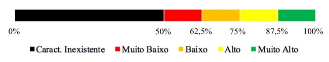 No entanto, para o presente estudo optou-se por adotar uma estratificação para analisar a intensidade das CCE’s nos alunos participantes, com o objetivo de melhor compreender as características dos alunos de administração. Desse modo, desenvolveu-se uma estratificação, dividindo-se a pontuação total em quatro partes. Essa escala transforma em percentual os limites obtidos, classificando-os em níveis em uma escala de razão de zero a 100%. Esses níveis são: Característica Inexistente, Muito Baixo, Baixo, Alto e Muito Alto. Para melhor visualização dos dados com essa estratificação, utilizou-se uma escala complementar de cores. Logo, para o instrumento das CCE’s (MANSFIELD et al., 1987), a estratificação ocorre da seguinte forma: Característica Inexistente de 0 a 50% (preto), Muito Baixo de 50,01% a 62,50% (vermelho), Baixo de 62,51% a 75% (laranja), Alto de 75,01% a 87,50% (amarelo), e Muito Alto de 87,51 a 100% (verde), o que pode ser verificado na Figura 1.