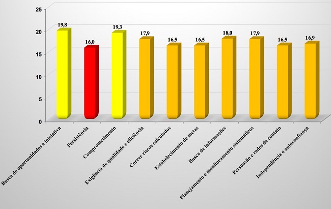 Para a execução do segundo objetivo específico – mapear as CCE’s dos referidos acadêmicos – realizou-se a aplicação, tabulação e análise do questionário sobre as CEE’s proposto por McClelland (MSI, 1990). Nesse sentido, os alunos evidenciaram características baixas e muito baixas, tais como: persistência, correr riscos calculados, estabelecimento de metas e persuasão e redes de contato. No entanto, esses alunos apresentaram características de nível alto para busca de oportunidades e iniciativa e comprometimento.