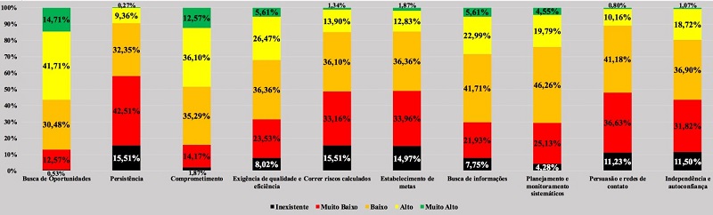 Em relação à intensidade muito baixa de características, identificada pela cor vermelha, apontam-se “Persistência” (42,51%) e “Persuasão e redes de contato” (36,63%). Esses resultados permitem inferir que o comportamento dos alunos investigados não está inclinado a influenciar ou persuadir e também que há falta de persistência ao buscar atingir determinado objetivo.