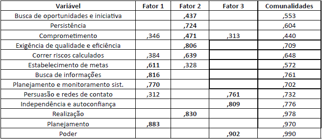 A partir do Quadro 5, verifica-se que os resultados coincidem com a classificação das características elaboradas por McClelland, em que a dimensão “Realização” compreende as características de “Busca de oportunidades e iniciativa”, “Persistência”, “Comprometimento”, “Exigência de qualidade e eficiência” e “Correr riscos calculados”; a dimensão “Planejamento” compreende as características de “Estabelecimento de metas”, “Busca de informações” e “Planejamento e monitoramento sistemáticos”; e a dimensão “Poder” contempla as características de “Persuasão e redes de contanto” e “Independência e autoconfiança”. Verifica-se que a análise realizada confirmou a estrutura fatorial do instrumento de CCE’s (MANSFIELD et al., 1987).