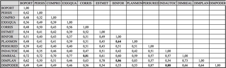 Verifica-se que as correlações entre as características foram associações positivas fracas, em sua maioria, o que indica haver relação direta entre tais características, sendo a CCE com maior correlação a “Busca de informações”, com 0,64, que pode ser considerada uma correlação positiva moderada. Referente à relação entre as características empreendedoras e as dimensões “Realização”, “Planejamento” e “Poder”, a maior significância foi verificada na dimensão “Poder”, com o valor 0,88, da característica “Independência e Autoconfiança”, o que denota uma correlação forte; e a menor significância pertenceu à característica de “Comprometimento”, na dimensão “Realização”, com o valor de 0,70, o que corresponde a uma correlação forte. Dentre as dimensões, o “Planejamento” obteve maior pontuação, 0,73, ou seja, uma correlação forte.