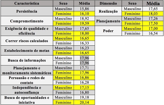 Já os respondentes do sexo masculino alcançaram maior pontuação nas CCE’s de “Independência e autoconfiança”, “Persuasão e redes de contato” (ambas pertencentes à dimensão “Poder”) e “Correr riscos calculados”. Isso pode ser explicado, conforme Balte (2010), porque os homens tendem a considerar mais os desafios ou riscos moderados nas situações, avaliando as alternativas e calculando os riscos para que tenham maior controle dos resultados. Para McClelland (1987), autoconfiança e independência são reveladas quando o indivíduo confia na sua própria capacidade e mantém seu ponto de vista diante da oposição ou de resultados contrários.