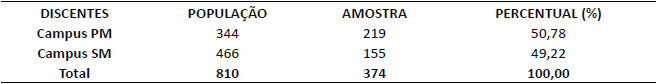 Conforme a equação exposta e considerando 95% de nível de confiança e 5% de erro amostral, a amostra mínima corresponde a 262 alunos. A população-alvo da pesquisa corresponde aos alunos de dois cursos de administração da UFSM (Campus Palmeira das Missões e Campus Santa Maria). Tendo em vista que a amostra de discentes deve representar a população dos dois cursos, a amostra final contempla, para fins de coleta de dados, um estrato de cada curso (Tabela 1).