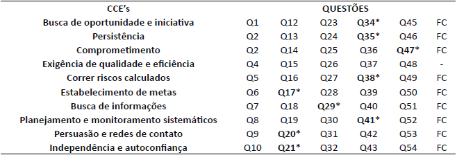 Para a coleta de dados, utilizou-se um questionário formado por um conjunto de 61 questões, sendo dividido em duas partes. A primeira parte possui seis questões acerca do perfil do pesquisado, incluindo aspectos referentes à idade, ao gênero, ao estado civil, à renda e ao semestre. A segunda parte é baseada nas dez CCE’s de McClelland (MANSFIELD, 1987), composta de 55 afirmações. Cada uma delas foi respondida de acordo com uma escala Likert de 5 pontos, conforme a seguinte gradação: 1 = nunca, 2 = raras vezes, 3 = algumas vezes, 4 = usualmente e 5 = sempre.