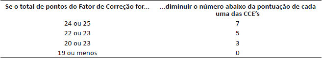 No Quadro 2, o (*) corresponde às questões negativas, em que a pontuação deve ser subtraída do resultado final da respectiva característica e deve-se acrescentar seis pontos ao final do somatório. As questões de número 11, 22, 33, 44 e 55 correspondem ao “Fator de Correção”, utilizado para evitar que, muitas vezes de modo inconsciente, o respondente apresente uma autoimagem excessivamente favorável. O Fator de Correção é utilizado se o somatório da pontuação dessas questões for igual ou superior a 20 pontos. Se isso ocorrer, todas as CCE’s deverão ser corrigidas com a subtração dos pontos correspondentes, conforme apresentado no Quadro 3.