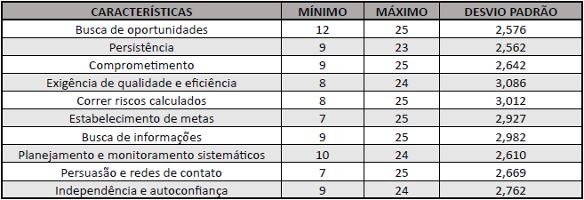 A pontuação final, após a aplicação do Fator de Correção, identifica a intensidade de cada uma das dez características empreendedoras. A pontuação máxima é de 25 pontos para cada uma das características. Quando o total for superior a 50% da pontuação, o indivíduo possui a respectiva característica e é considerado empreendedor (MANSFIELD et al., 1987).