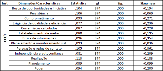 Os resultados para o teste de normalidade indicaram que os escores das características e suas respectivas dimensões obtiveram significância menor que 0,05, o que significa que a distribuição dos dados difere de uma distribuição normal (Sig.<0,05). No entanto, para Leech, Barret e Morgan (2005), pode-se considerar as variáveis aptas para testes paramétricos quando o Skewness constar entre -1> e <1, momento em que, para os autores, ocorre uma normalidade aproximada, permitindo que se apliquem testes paramétricos.