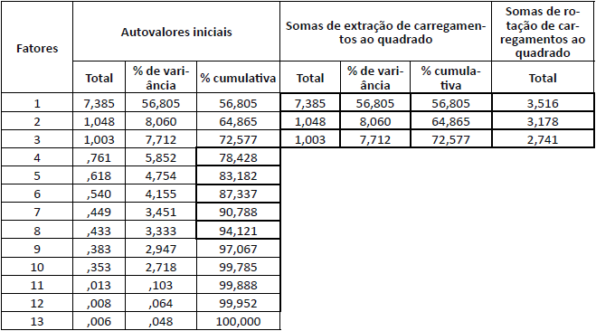 No Quadro 4, consta a contribuição percentual dos fatores e a variância total, indicando que três fatores representam 72,57 % de contribuição.