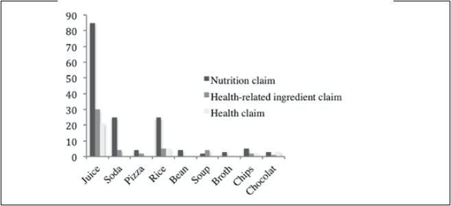 Regarding the claims accordingly to their belonging food categories, they appear in a larger scale in juices, soda and rice (Chart 1). More specifically, nutrition claims comprise most of the claims in these three food categories, consisting the only claim in bean and broth categories. The health-related ingredient claim only represents the majority of the claims in the soup category, while the health claim doesn't appear in a larger amount in any of the situations.