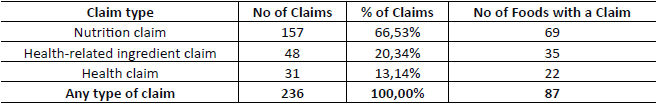 Nutrition claims are the ones most found in our sample, accordingly to Table 2, representing 66,53% of the total of claims. Health-related ingredient claims (20,34%) and health claims (13,14%) are found in smaller amounts. Moreover, food carrying any type of claim tends to carry multiple claims.