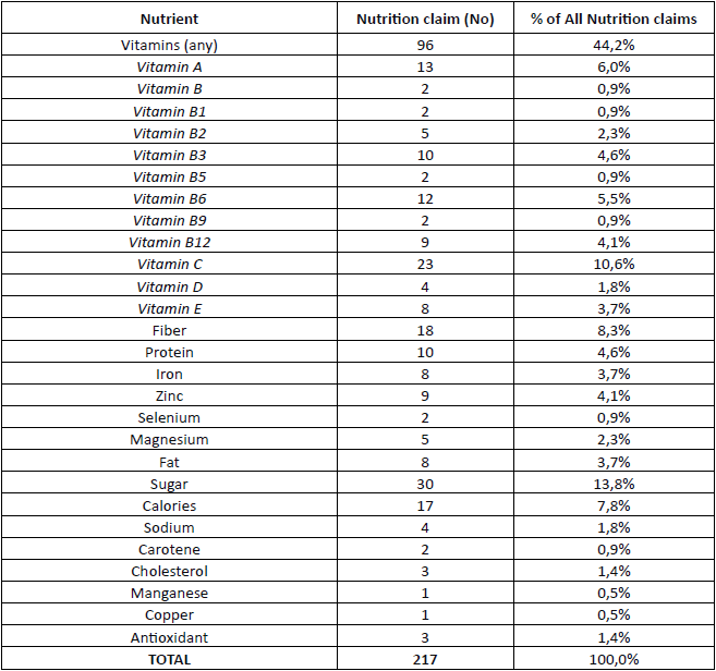 In total, there were 217 nutrition claims found in the 9 pre-defined food categories, considering each mentioned nutrient. Almost half of these claims referred to vitamins, as it can be been on Table 3. More specifically, vitamin C was the responsible of almost one quarter of the vitamin claims (e.g., "rich in vitamin C"), followed by vitamins A and B6. The following higher presences of nutrient claims were 13,8% related to sugar amounts (e.g., "no added sugar") and 8,3% related to fiber content (e.g., "high amount of fibers").