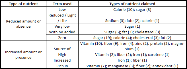 Due to differences in methodologies, product samples and strategies, it is difficult to compare our results with previous studies. However, it is important to show possible similarities. Nutrition claim usually appears as the most used claim, in different locations. Results of studies in Europe (HEIKE et al., 2016), Ireland (LALOR et al., 2010), US (COLBY et al., 2010) and Australia (WILLIAMS et al., 2003) also report the prevalence of nutrition claims in their samples.