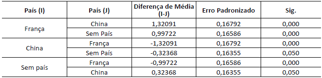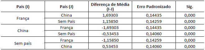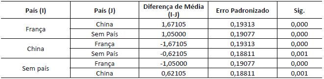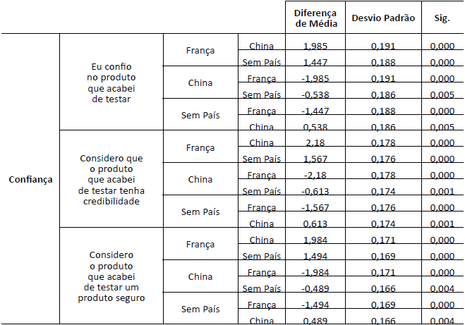 Na análise da confiança (Tabela 7), o Grupo 1 (França), quando comparado ao grupo de controle, obteve uma diferença de média significante (p=0,000) de 1,511 pontos. Já o Grupo 2 (China), quando comparado ao grupo de controle, obteve uma diferença significante (p=0,001) de -0,546 pontos. Pode-se observar que o Grupo 1 (França) atribuiu uma análise significamente superior aos demais grupos no que diz respeito a confiança. Por sua vez, o Grupo 2 (China) atribuiu conceito significantemente inferior aos demais grupos.