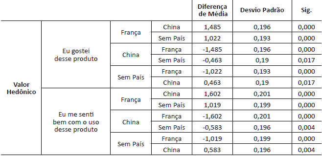 Na análise do valor hedônico (Tabela 1), quando se estabeleceu um comparativo entre os resultados da primeira questão (“Eu gostei desse produto”) para o Grupo 1 (França) e o grupo de controle, observou-se uma diferença significante (p=0,000) de 1,022 pontos. Da mesma forma, quando se comparou o Grupo 2 (China) e o grupo de controle, verificou-se uma diferença significante (p=0,017) de -0,463 pontos, o que mostra que o grupo que recebeu o creme hidratante, acreditando que ele fosse francês, atribuiu uma análise sobre o fato de ter gostado do produto significantemente superior aos demais grupos. Já o Grupo 2 (China), em relação ao fato de ter gostado do produto, atribuiu conceito significantemente inferior aos outros grupos.