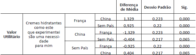 O valor utilitário (Tabela 2) foi medido através da pergunta “Cremes hidratantes como este que experimentei são uma necessidade para mim”. O Grupo 1 (França), comparado ao grupo de controle, apresentou diferença significante (p=0,000) de 0,925 pontos. Já o Grupo 2 (China) não apresentou diferença significante (p=0,065) em relação ao grupo de controle. Sendo assim, pode-se observar que o fato das pessoas acreditarem que o creme hidratante era francês fez com que elas gostassem mais do produto e o fato das pessoas acreditarem que o produto era chinês fez com que as pessoas gostassem menos.