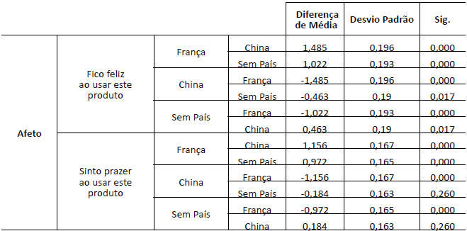 Estabelecendo-se um comparativo dos resultados da primeira pergunta relacionada ao afeto (“Fico feliz ao usar este produto”) entre o Grupo 1 (França) e o grupo de controle, observou-se uma diferença significante (p=0,000) de 1,022 pontos. Da mesma forma, quando comparado Grupo 2 (China) com o grupo de controle, também pode-se observar uma diferença significante (p=0,017) de -0,463 pontos. Isso mostra que o grupo que recebeu o creme hidratante acreditando ser francês atribuiu uma análise significantemente superior aos demais grupos. Já o fato das pessoas acreditarem que o creme hidratante era chinês fez com que atribuíssem um conceito significantemente inferior aos demais grupos. Para a outra questão relacionada ao afeto (“Sinto prazer ao usar este produto”), os resultados comparativos entre o Grupo 1 (França) e o grupo de controle tiveram uma diferença significante (p=0,000) de 0,972 pontos. Quando comparado o Grupo 2 (China) com o grupo de controle pôde-se observar que não houve uma diferença significante (p= 0,260) entre os grupos. Os resultados relacionados a estas duas questões podem ser observados na Tabela 4.