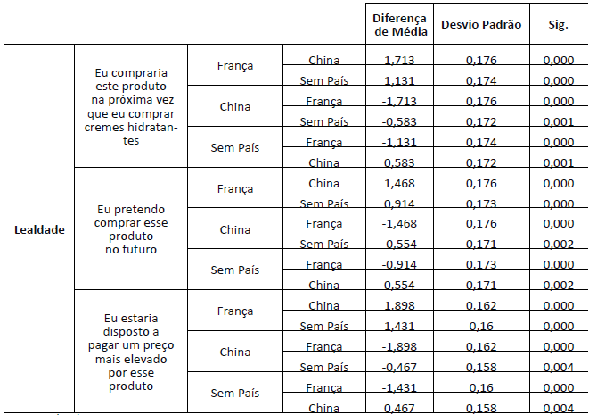 No que tange ao construto lealdade (Tabela 9), o grupo que experimentou o creme hidratante acreditando que fosse francês, em relação ao grupo de controle, obteve uma diferença significante (p=0,000) de 1,158 pontos. Já o grupo que experimentou o creme hidratante acreditando ser chinês apresentou uma diferença significante (p=0,000) de -0,534 pontos para o construto, se comparado ao grupo de controle.