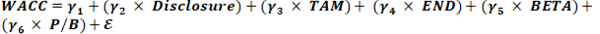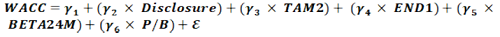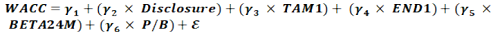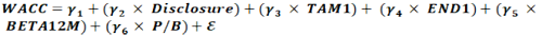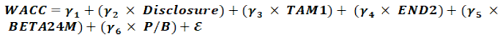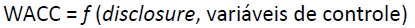Baseando-se no trabalho de Alencar (2007, p. 51), porém considerando na presente pesquisa o WACC como variável dependente, já que se busca uma associação com o custo total de capital, e a não inclusão da variável de controle que indica a emissão de ADR (American Depositary Receipts) não relevante para a amostra utilizada nesta pesquisa. Assim, a equação também pode ser escrita como: