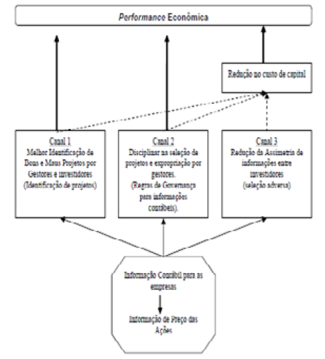 A pesquisa de opinião elaborada por Eccles et al (2001) mostrou que dentre os pontos citados de maior benefício advindo de maior transparência nas empresas, destaca-se a redução do custo de capital das empresas. Neste mesmo contexto, Lambert, Leuz e Verrecchia (2005) demonstraram analiticamente que a informação contábil influencia o custo de capital de duas maneiras: por meio de efeitos diretos, onde o aumento da qualidade da informação não afeta os fluxos de caixa, mas sim a habilidade dos participantes do mercado realizarem estimativas acerca da distribuição dos fluxos de caixa futuros e por meio de efeitos indiretos, em que as informações de maior qualidade afetam as decisões reais das empresas que, por sua vez, influenciam a covariância de seus fluxos de caixa com os das outras empresas. Ainda nesta linha, Bushman e Smith (2001) afirmaram que a informação contábil afeta a performance econômica através de três canais, que, por sua vez, se fundamentam na diminuição do custo de capital através da informação, como pode ser visto na Figura 2.