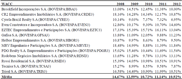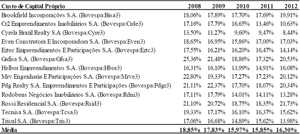 A partir da análise da Tabela 1, observa-se uma diminuição em 14% do custo de capital próprio das empresas, enquanto que na Tabela 2 a redução do custo de capital de terceiros é de 12% e o custo de capital total das empresas, Tabela 3, tem redução de 25% no período, sendo que em todos os casos os maiores valores de custo de capital foram apresentados em 2008. Isso pode ter sido um reflexo da crise financeira internacional que aumentou a aversão a riscos dos investidores que, por sua vez, passaram a exigir retornos mais altos por seus investimentos.
