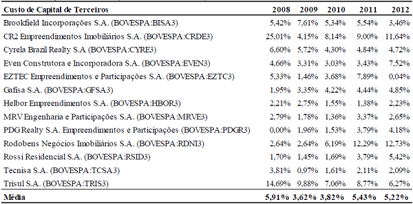 Para a obtenção do custo de capital de terceiros, foi utilizada a Equação 3 e, para o cálculo do mesmo, os valores das variáveis foram captados diretamente das demonstrações contábeis consolidadas das empresas selecionadas, tais como Balanço Patrimonial, Demonstração do Resultado do Exercício e Notas Explicativas, entre os anos 2008 a 2012.