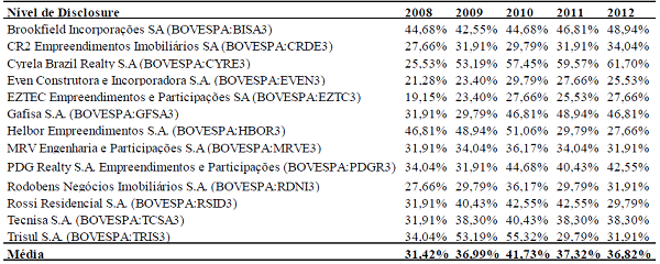 Na análise a Tabela 4, observa-se que houve um aumento de 17% no nível de disclosure das empresas durante os anos analisados e que 2008 apresentou o menor valor para esta variável.
