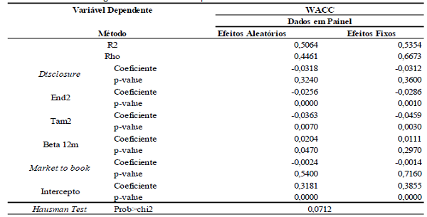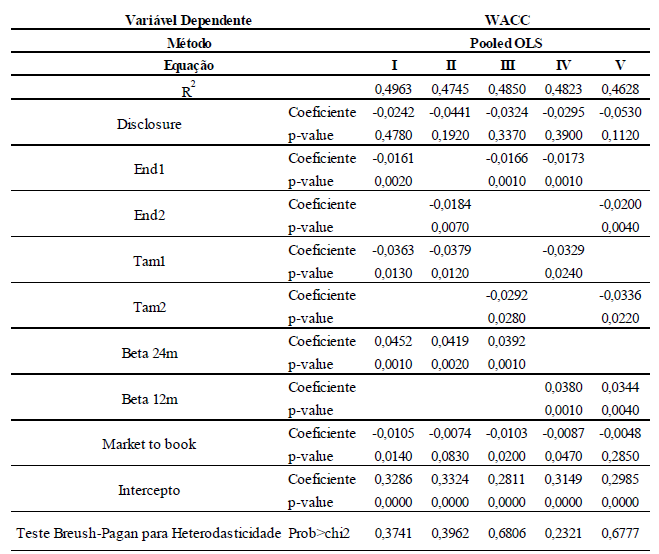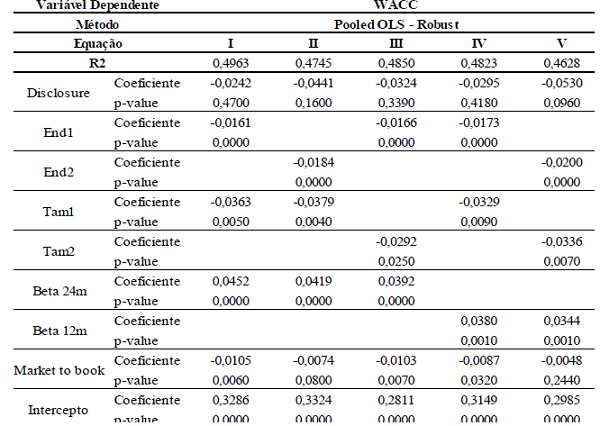Pode-se observar na Tabela 5, que a variável disclosure não se mostrou significativa estatisticamente ao nível de 5%, definido como o mínimo aceitável neste trabalho, em nenhuma das equações testadas, uma vez que os p-values encontrados são maiores que o nível de 0,05. Se a mesma análise fosse realizada e com o aceite para relação de um nível de significância de 10%, os resultados para esta regressão, se manteriam os mesmos, ou seja, não teríamos evidências suficientes para afirmar que existe uma relação causal entre custo de capital e nível de disclosure.
