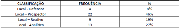 Foi possível inferir que a maioria das empresas está voltada para o contexto ambiental Local e possuem como dimensão predominante no processo de formulação da estratégia o perfil de Prospectores (46%). Isso mostra que essas empresas estão muito voltadas a trazer novidades e novos serviços para a população local, buscando serem sempre as primeiras a oferecer esses serviços ao público local.