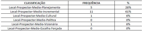 Verificou-se que a principal tipologia de estratégia apresentada pelas empresas pesquisadas é a perspectiva Incremental, com uma grande diferença percentual sobre as outras tal tipo estratégico envolve 57,1 % das respostas. A partir do ponto de vista da perspectiva incremental, a estratégia é formulada propositadamente e é intencional, mas pela sua complexidade os gestores não conseguem analisar todas as variáveis do ambiente e nem estabelecer objetivos precisos. Nesse processo a estratégia é desenvolvida através de feedbacks de fases anteriores., no qual problema e solução devem ser redefinidos ou novamente desenvolvidos.