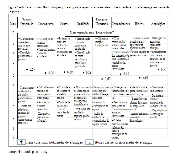 Figura 1 – Síntese dos resultados da pesquisa empírica segundo as áreas de conhecimento estudadas em gerenciamento de projetos