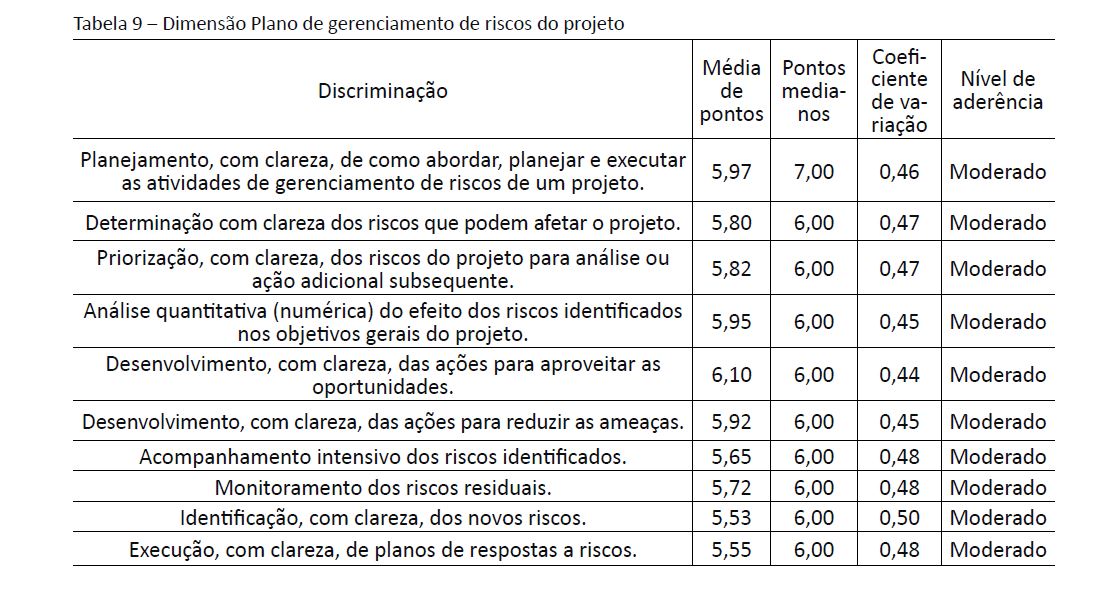 * Dimensão Plano de gerenciamento de riscos do projeto (Tabela 9):