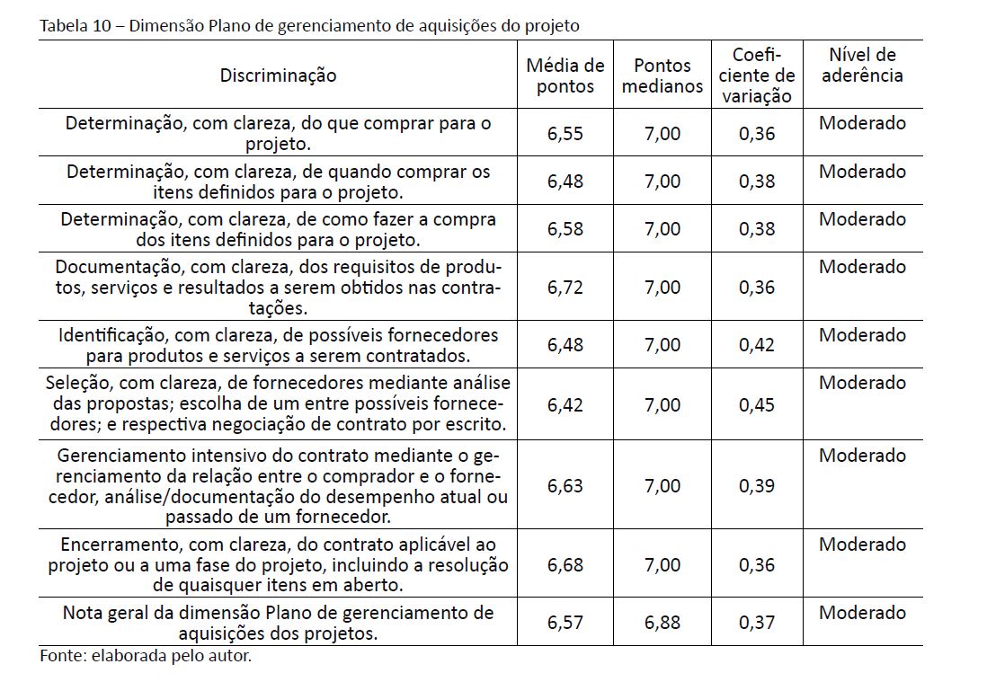 * Dimensão Plano de gerenciamento de aquisições do projeto (Tabela 10):