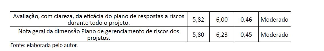 Com o resultado médio de 5,80 pontos, essa dimensão evidenciou uma aderência moderada, sugerindo vulnerabilidade em termos de boas práticas, uma vez que as variáveis que a operacionalizaram apresentaram uma pontuação média, relativamente homogênea. O maior gap foi encontrado na variável falta de clareza na identificação dos novos riscos (pontuação média de 5,53 pontos), o que se distancia, de forma plena, da situação ideal em termos de boas práticas, como encontrado nas abordagens de Kerzner (2006) e do PMI (2008), para os quais essa atividade é fundamental para aumentar a probabilidade e o impacto dos eventos positivos.