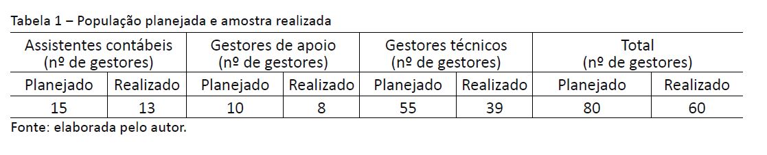 Assim, os dados foram coletados por meio de um questionário estruturado, com nove dimensões ilustrativas das práticas de gerenciamento de projetos: escopo e integração de projetos contou com dez indicadores; cronograma do projeto, sete indicadores; custos do projeto, quatro indicadores; qualidade do projeto, seis indicadores; recursos humanos do projeto, 11 indicadores; comunicações do projeto, seis indicadores; riscos do projeto, 12 indicadores; e aquisições do projeto, nove indicadores. Os entrevistados opinaram sobre a presença das situações investigadas no gerenciamento dos projetos da PPG, utilizando uma escala de notas de 0 a 10 pontos, sendo que a nota “0” significou discordo totalmente e a nota “10” significou concordo totalmente. Esse questionário foi encaminhado a uma população composta por oitenta gestores envolvidos no processo de gerenciamento de projetos, com retorno de uma amostra composta por sessenta gestores. Assim, a amostra da pesquisa é não probabilística, composta pelas seguintes funções técnicas: assistentes contábeis (13 gestores), gestores de apoio (oito gestores) e gestores técnicos (39 gestores), conforme registrado na Tabela 1.
