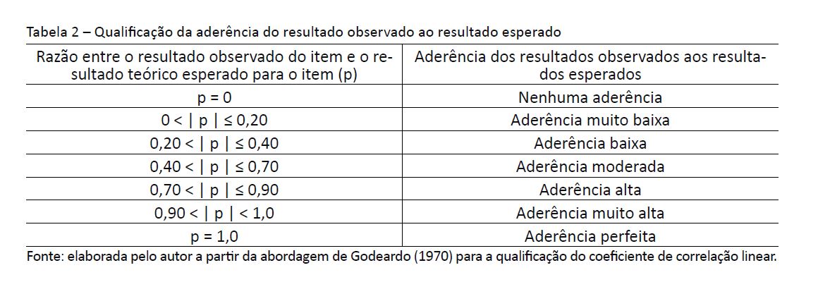 Registre-se que esse coeficiente de correlação mede “a força ou o grau de associação linear entre duas variáveis” (GUJARATI; PORTER, 2011, p. 43). Portanto, mesmo não sendo a técnica de análise estatística aplicada no presente estudo, pareceu que a convenção que orienta a sua qualificação seria didaticamente útil para orientar a qualificação de aderência da pontuação observada para um item (variável ou dimensão ou objetivo) e a pontuação máxima teoricamente esperada para esse respectivo item (10 pontos, no caso do presente estudo).