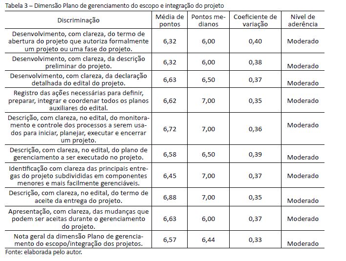 * Dimensão Plano de gerenciamento do escopo e integração do projeto (Tabela 3):