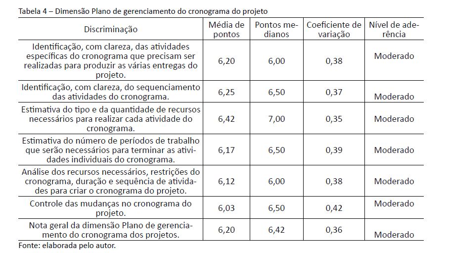 * Dimensão Plano de gerenciamento do cronograma do projeto (Tabela 4):
