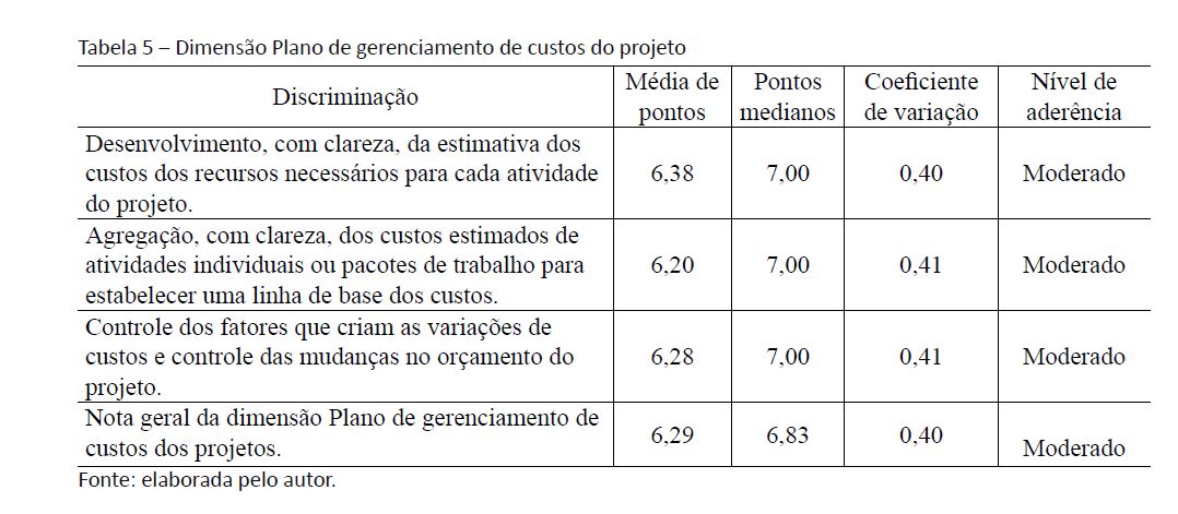 * Dimensão Plano de gerenciamento de custos do projeto (Tabela 5):