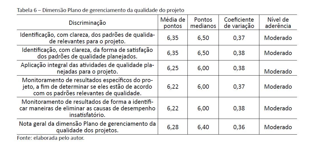 * Dimensão Plano de gerenciamento da qualidade do projeto (Tabela 6):